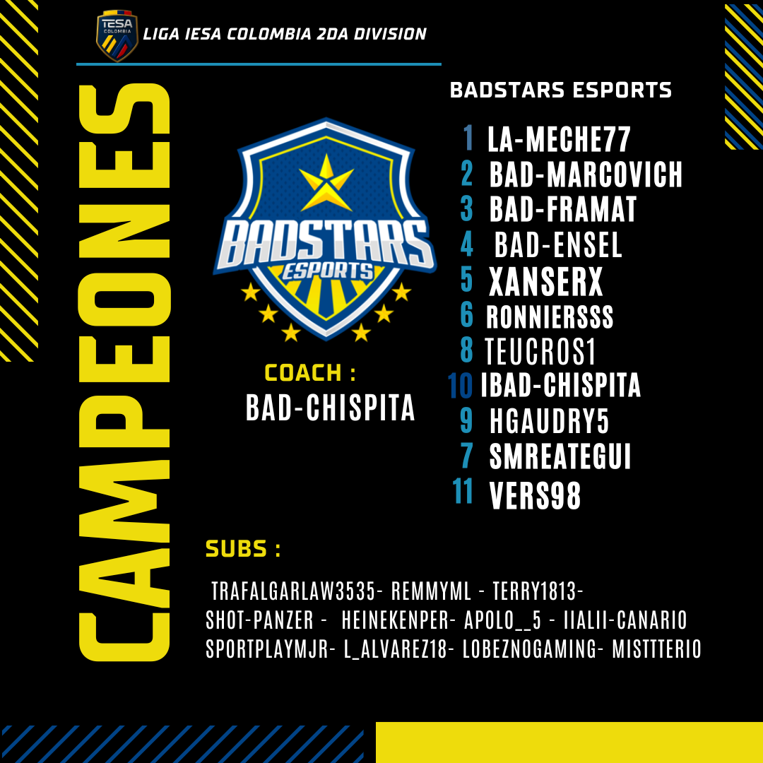 BADSTARS ESPORTS es el actual CAMPEON en IESA COLOMBIA 2DA DIVISION.